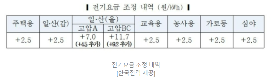 ▲ 대용량 사업자(산업용과 일반용)에 대해서도 전기요금을 추가로 인상하기로 결정 *공급 전압에 따라 차등 조정. 고압A 전기는 ㎾h당 7원, 고압BC 전기는 ㎾h당 11.7원으로 오름