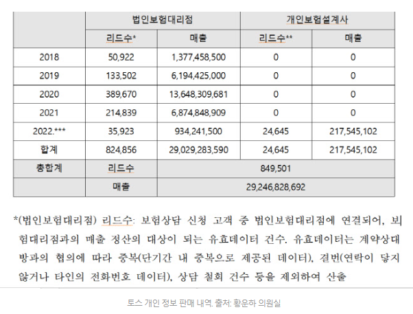 ▲ 국회 정무위원회 소속 더불어민주당 황운하 의원실을 통해 확보한 자료에 따르면 토스는 2018년부터 올해까지 여러 법인 보험 대리점(GA)과 보험 설계사에게 개인정보 82만 명분을 팔아 총 292억 원에 수익을 냄 *source : 국민일보