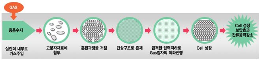 > 일정 온도와 압력에서 고분자 시료를 seCO₂(초임계 CO₂)에 포화시킨 뒤 평형 상태에서 압력을 급강하시키면 과포화에 의한 열역학적 불안정으로 핵이 생성된다. 핵은 cell로 성장하다가, CO₂ 농도가 감소하면서 성장이 정지되는 데 이때 미세한 닫힌 기포(Closed cell) 구조를 가진다.