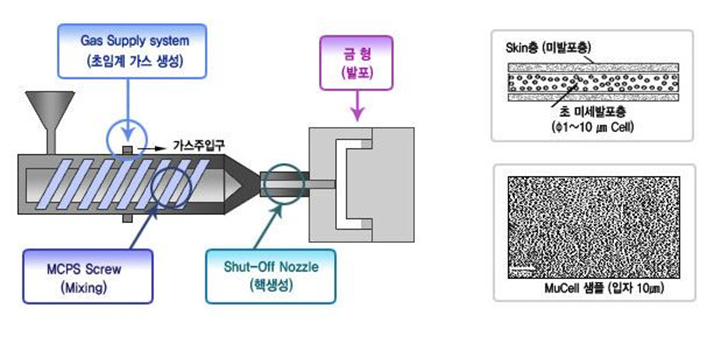 '초임계 발포 시스템'이란 성형공정 중 기포를 생성하고, 고분자 수지 내에 균일하게 분산시켜 제품을 제조하는 방법이다. 발포 성형을 통해 완성된 발포 플라스틱은 단열, 보온, 완충, 방음, 신축, 유연성 등에 특성을 향상하는 데, 특히 다공성 구조로 강도는 그대로이면서 무게를 가볍게 하는 장점이 있다.