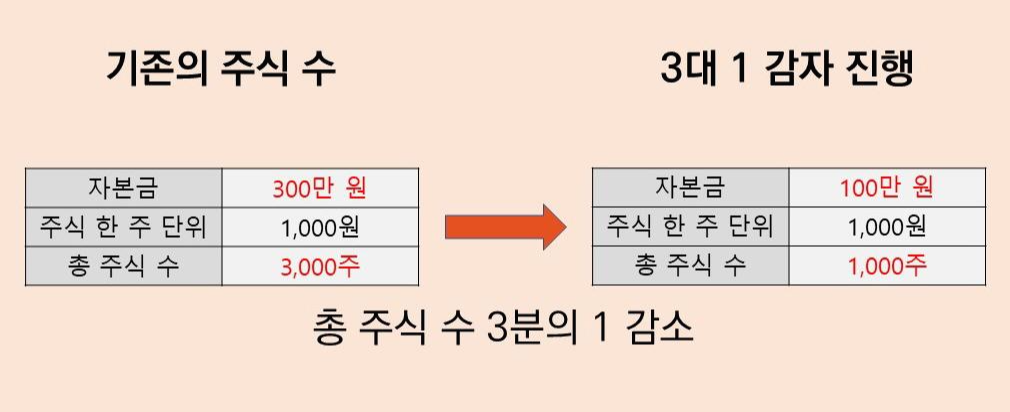예를 들어 자본금이 300만 원이고, 주식의 한 주 단위가 1,000원일 경우, 총 주식 수는 3,000주다. 하지만 3대 1 감자를 하게 되면 자본금은 100만 원이고, 총 주식 수는는 1,000주가 된다. 총 주식의 수가 3분의 1로 날아가는 거고, 주주들은 그 비율의 주식 수를 아무런 보상도 받지 못한 채 없어지는 것이다.