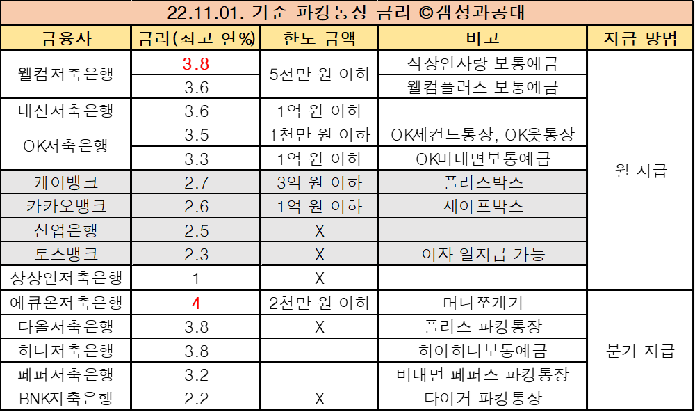 22.11.01. 파킹통장 금리 비교