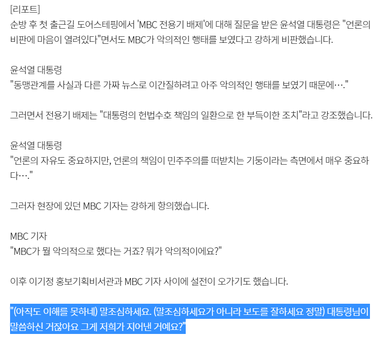 *개인적으로 윤석열 대통령은 최소한 공적인 자리에서 오해를 일으켜 죄송하다는 말을 먼저 언급한 후에 MBC 보도 문제를 지적했어야 한다고 본다.