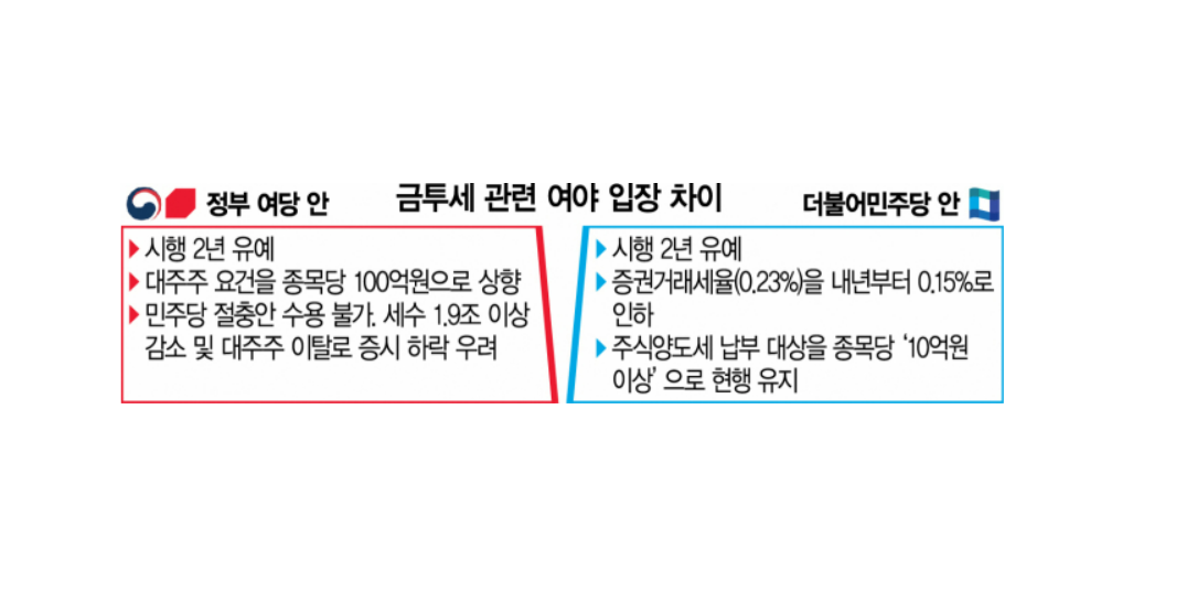 ▲ 또한, 유예를 생각하며 절충안도 여야에서 의견을 모으는 중인데 여당은 대주주 기준 완화, 증권거래세 소폭 감소(0.23% > 0.2%)를 주장하고 있고, 야당은 증권거래세 완화를 주장하고 있다.(0.23% > 0.15%)