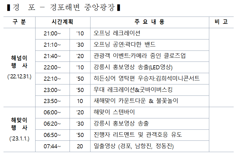 - 경포해변에서는 강릉 지역 팀의 해넘이 버스킹 공연과 새해 카운트다운 행사, 자정이 넘어가는 시간에 맞추어 불꽃놀이 행사가 진행