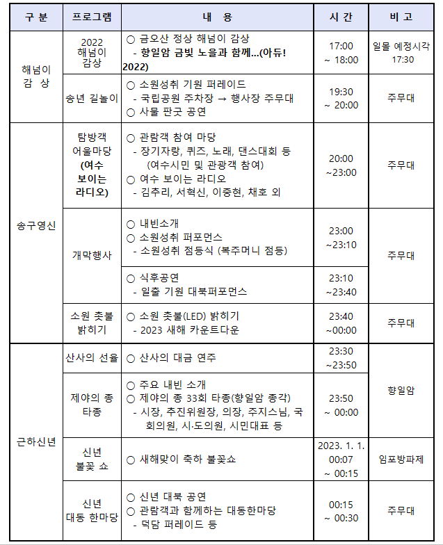 - 2022년 12월 31일 22시 ~ 2023년 1월 1일 10시, 일출시간 : 7시 31분(예정)