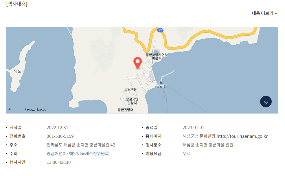 - 요금은 무료이며, 해남군 송지면 땅끝마을 일원에서 진행
