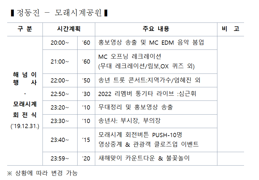 - 31일 20시부터 경포해변 중앙광장과 정동진 모래시계 공원에 특설무대가 설치