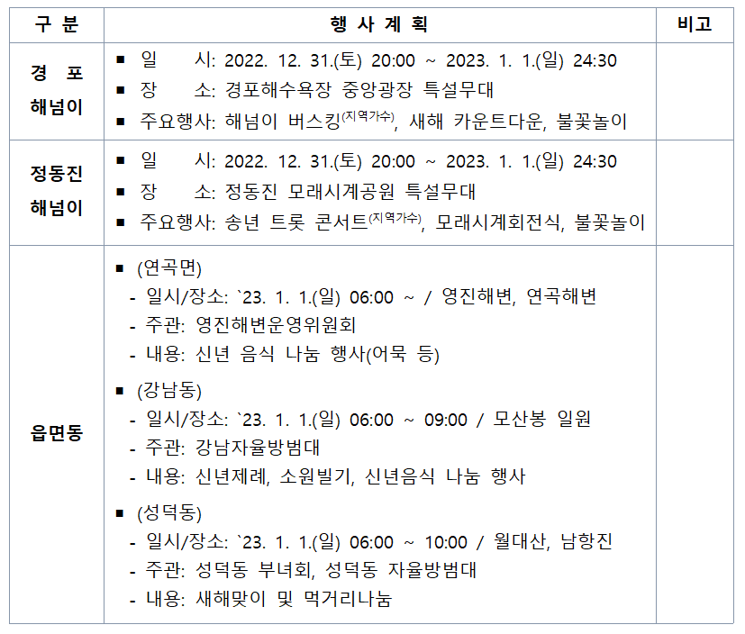 - 2022년 12월 31일부터 새해 2023년 1월 1일까지 해넘이, 해맞이 행사를 경포해변과 정동진 모래시계 공원에서 개최.