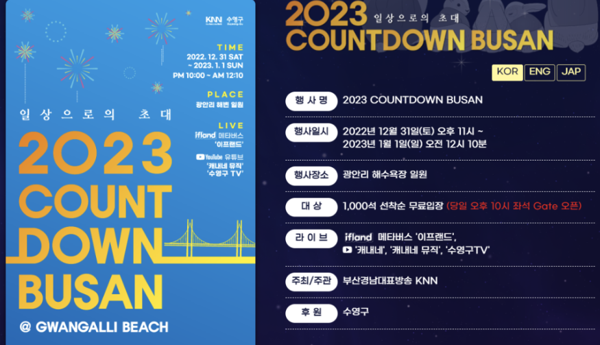 - 광안리 해변에서 22.12.31. 23:00 ~ 23.01.01. 00:10까지 진행