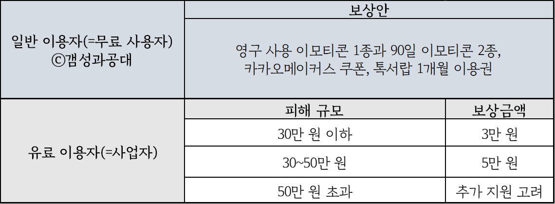 - 카카오가 피해 사례 접수를 시작한 뒤, 보상안을 발표했다. 우선 일반 사용자(=무료 사용자)들에게 평생 이모티콘 1종(=춘식이), 90일 이모티콘 2종을 무료로 제공한다.