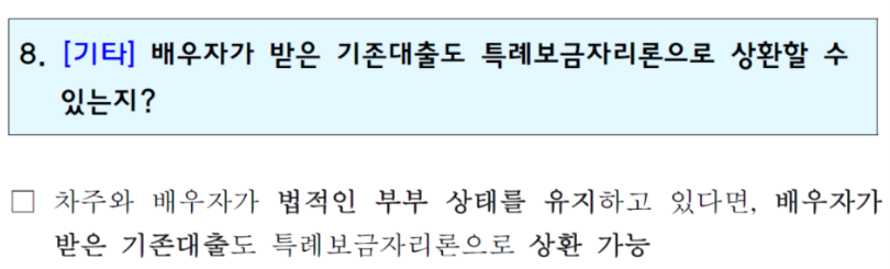 · 본인 외 배우자가 받은 기존 대출 또한 대환 대출이 가능하다. *대환 대출이란 보유 중인 대출을 더 이상적인 조건을 가진 신규 대출로 전환하는 것