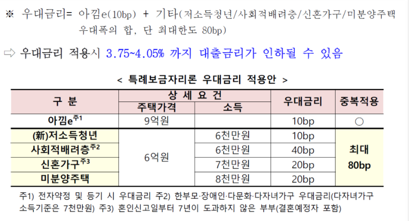 **저소득청년 우대금리가 추가됐는데, 이는 만 39세 이하 + 주택가격 6억 원 이하 + 부부합산소득 6천만 원 이하인 경우 해당