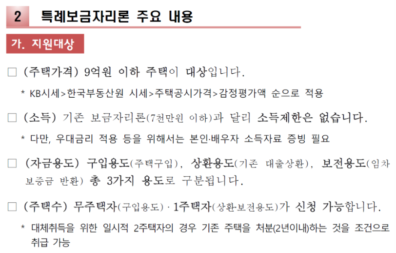 · 주택가격 9억 원 이하, 무주택자 혹은 1주택자 *보금자리론이 소득한도 7천만 원이 있던 것과 달리 특례보금자리론은 소득한도 조건X