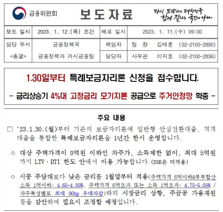 22년 말에 경제부터가 23년 업무보고와 함께 23년 1분기 중 특례보금자리론 시행을 예고한 뒤, 금융위원회에서 특례보금자리론 금리, 시행시기를 확정하고 발표했다.