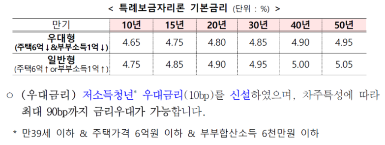 · 주택가격 6억 원 이하이고, 부부합산 소득 1억 원 이하인 경우 4.65%~4.95%.