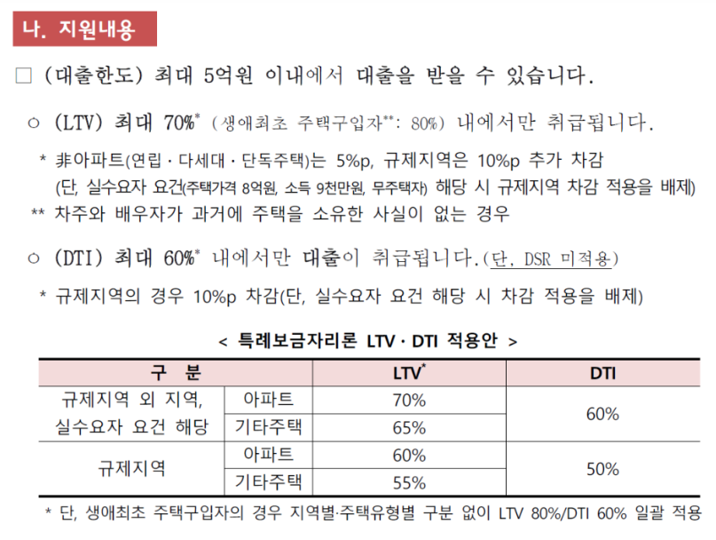 작년 업무보고에서 미리 밝혔던 것처럼 9억 원 이하 주택에 대해 5억 원까지 대출을 해주는 상품으로 23년 1년만 한시적으로 시행되는 상품이다. DTI만 적용하고, DSR은 적용하지 않는다.