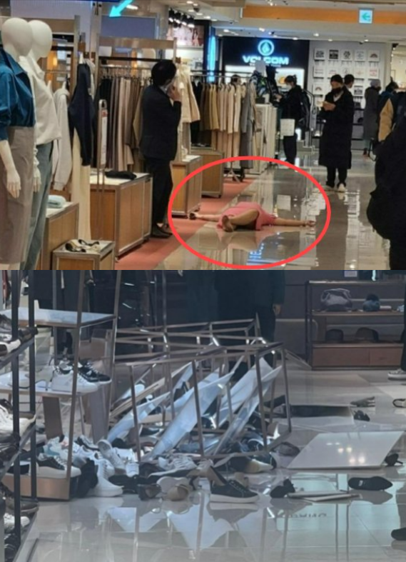 커뮤니티에 올라온 목격담에 의하면 해당 매장에 진열대가 쓰러지고, 수십 켤레가 바닥에 있다. 그리고 분홍 원피스를 입은 해당 여성이 맨발로 대자로 누워있다.
