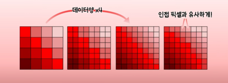 '업스케일링'이를 설명하기 위해 예를 들어보자. 1080p 디스플레이를 4k 디스플레이에 표시하게 되면, 픽셀 수의 차이가 너무 크다. 즉, 인접한 픽셀 간 색 대비율이 너무 커서 화면이 깨진 것처럼 보이는데 데이터양을 늘려서 인접픽셀과 유사하게 대비율을 낮춰 4k 화면과 비슷하게 화질을 높여지는 기술을 말한다.