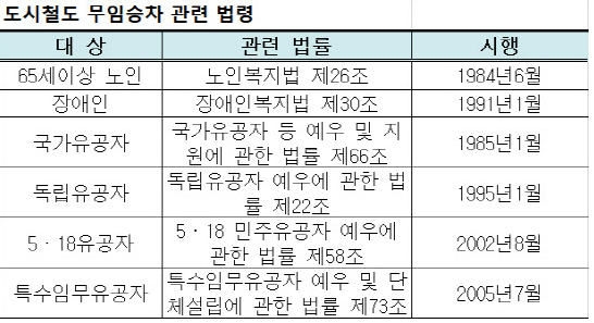 철도통계연보에 따르면 서울·부산·대구·인천·광주·대전·경기 등 전국 7개 광역자치단체에서 운영 중인 도시철도(지하철)의 무임승차 인원은 21년 기준으로 3억 7천795만 명, 운임손실액은 5천74억 원에 달하며, 무임승차자의 83%가 노인인 것으로 파악됐다.