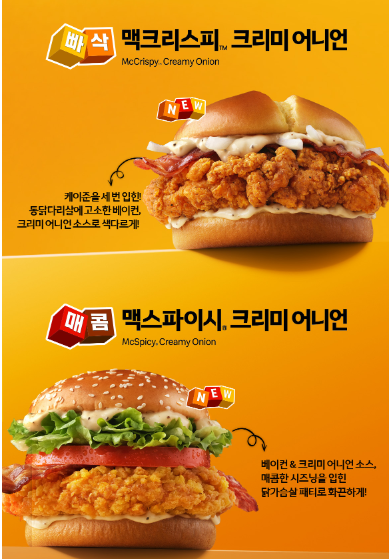 맥크리스피 크리미 어니언은 100% 통닭다리살, 맥스파이시 크리미 어니언은 100% 닭가슴살로 이뤄져 있다. 둘다 소스는 동일하게 크리미 어니언이며, 맥스파이시는 토마토와 베이컨이 어우러져 있다. 버거킹도 치킨킹을 밀더니, 요즘은 치킨버거가 대세인가 싶다.