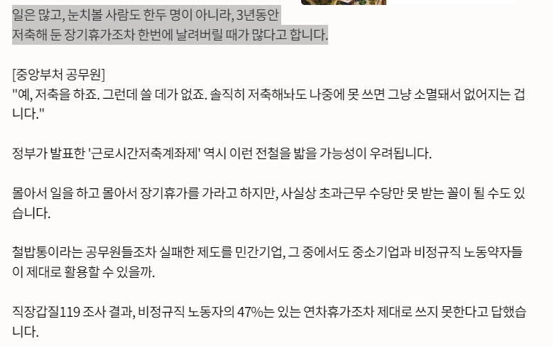 지금 당장 연차도 눈치 보면서 쓰고 있으며, 이월된 연차도 못 쓰게 되는 게 대다수다. 수당을 안 주려고 시차나 연차 등으로 변경해서 제공하고 이마저도 못 쓰는 게 현실. 게다가 포괄임금제를 악용하는 곳도 너무나 많은데 이에 대한 해결책 없이 근로시간 개편은 말도 안 된다는 것