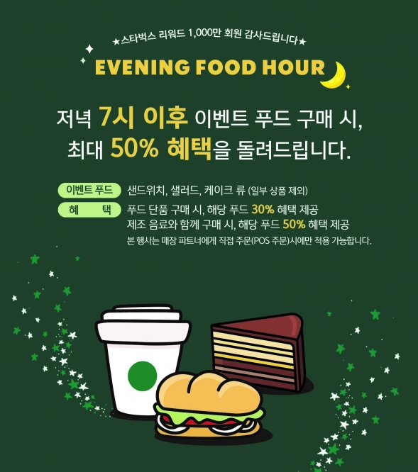 스타벅스는 이번에 2011년 이후 스타벅스 리워드 서비스를 시작한 뒤, 회원의 가입자수가 1,000만 명을 돌파한 기념으로 한 달 동안 최대 50% 할인 행사를 진행한다. *스타벅스 푸드를 구입하는 고객