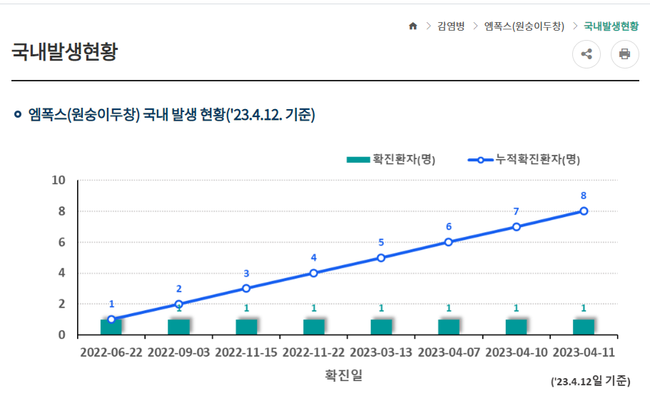 국내에서 22년 6월 22일 엠폭스 첫 환자가 발생한 후 8명의 환자가 발생했다. 그동안은 해외유입과 관련됐으나 최근 감염된 환자는 해외유입과 관계가 없는 국내 감염으로 추정돼 역학조사가 진행 중이다.