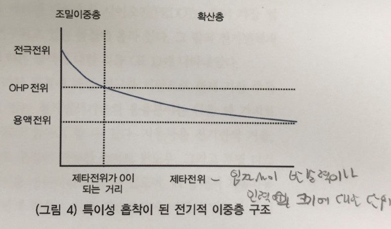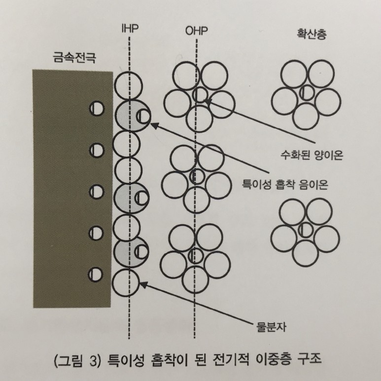: 전극이 용액에 담기면, 전극과 용액 사이에서 대전되는 현상이 일어난다. 전극이 (-)면, 용액은 (+)로 대전되고, 반대일 경우 전극이 (+), 용액은 (-)로 대전된다.