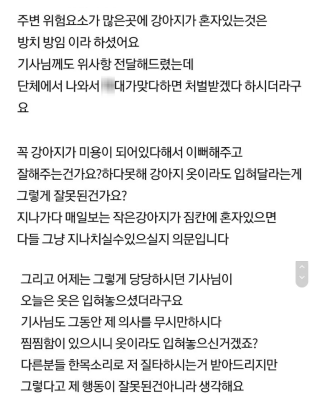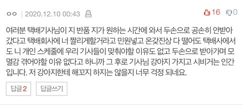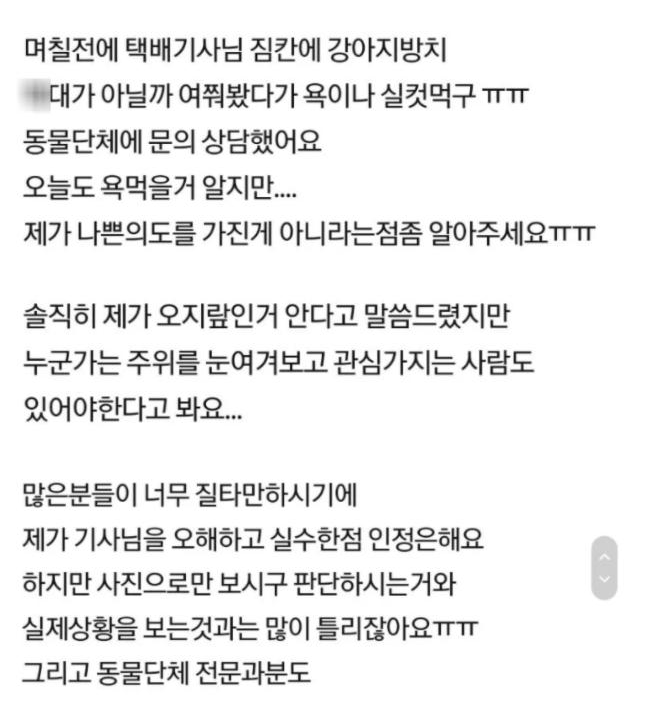 이에 해당 게시물을 본 사람이 어이가 없어 댓글을 남긴다. 본인은 동네 주민이고 항상 보는 택배기사님이라 자주 봤다고 한다. 동네 주민들도 모두 좋아하고 학대 절대 아니라는 말을 남긴다.