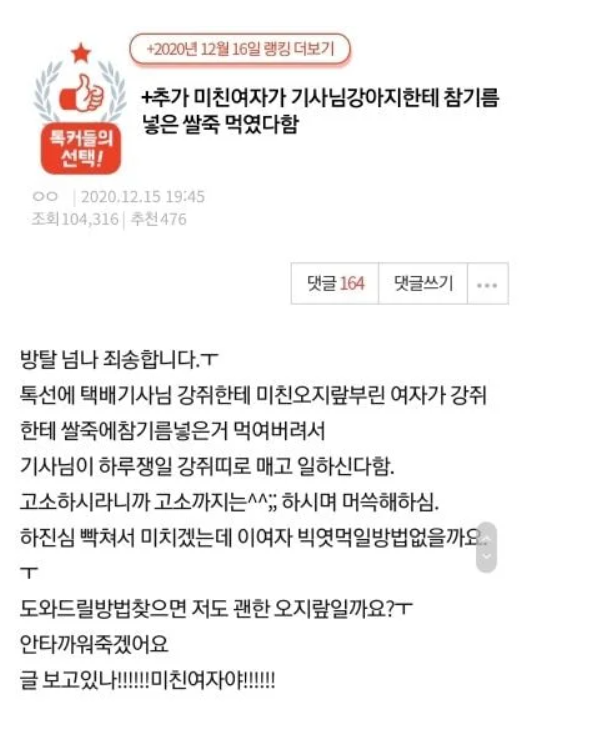 심지어 그 여자분은 강아지에게 쌀죽에 참기름을 넣어서 먹였다고 한다.(*강아지에게 참기름을 과도하게 먹일 경우 비만과 췌장염 설사 유발)