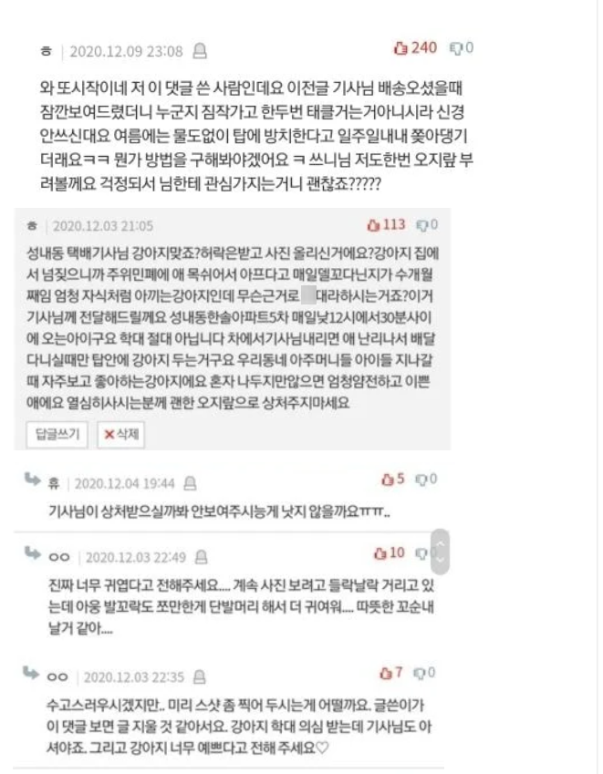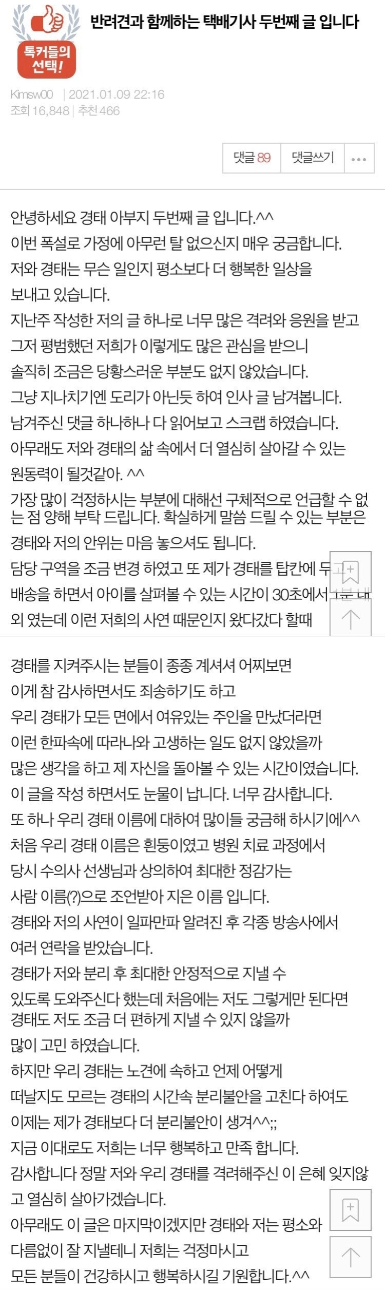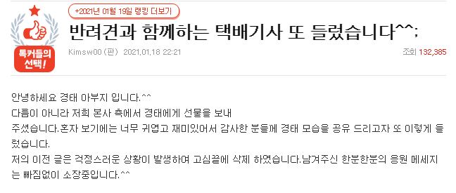 이후 택배기사 A씨도 종종 썼던 근황을 모두 삭제하셨고, 현재는 명예 택배기사가 된 경태의 이야기만 남긴 상태다. 아무튼 일이 잘 해결돼서 다행.
