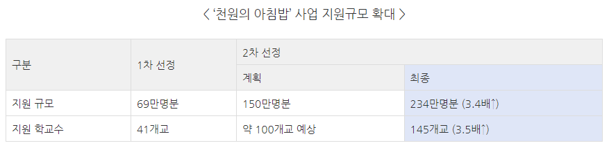 반응은 굉장히 좋았는데, 물가 부담도 줄고, 식사량과 함께 아침 식사 소비가 확산됐기 때문이다. 이에 정부는 당초보다 3배 이상 사업을 확대하기로 결정했다.