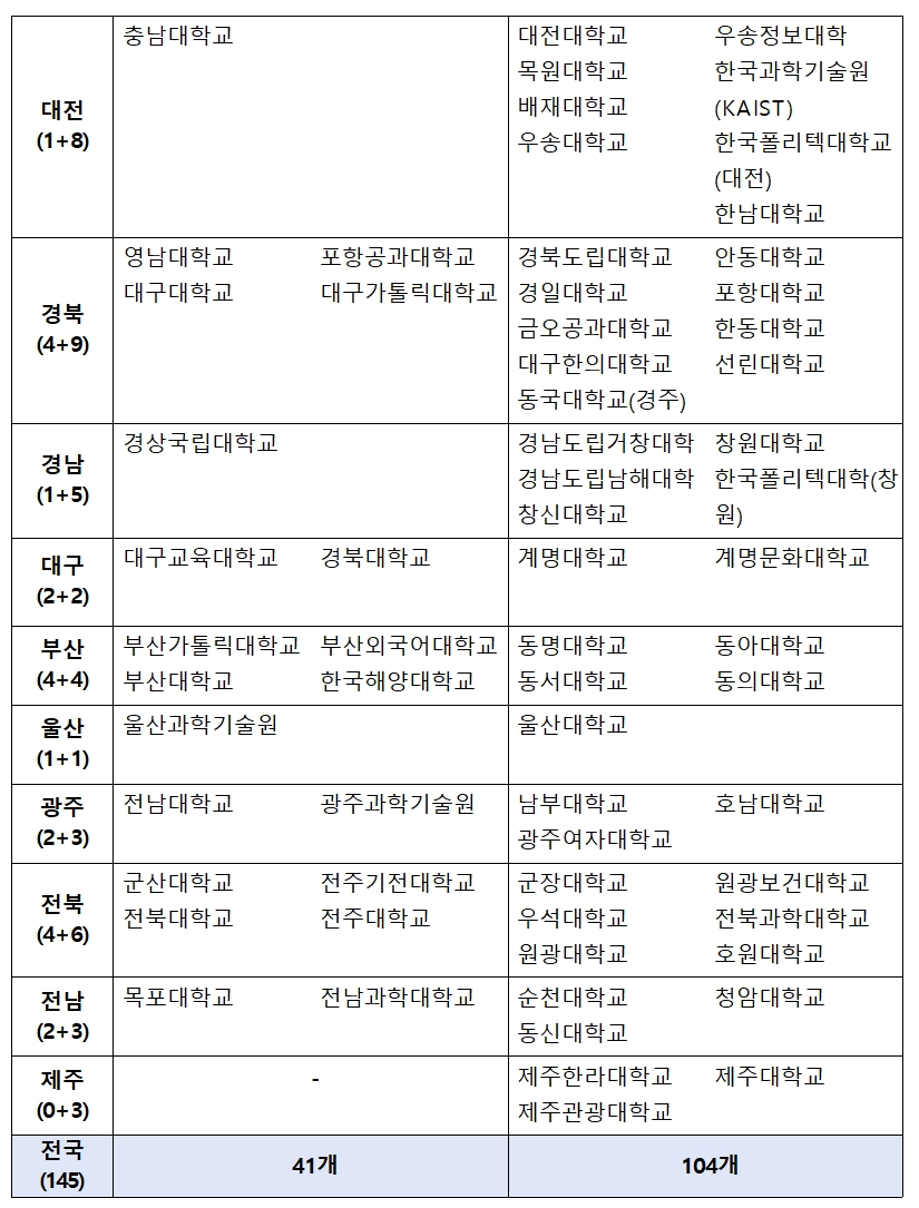 수도권 55개교, 비수도권 90개교가 선정 * 지역/참여대학 수(145개) : 서울/29, 경기/23, 인천/3, 강원/7, 충남/13, 충북/5, 대전/9, 경북/13, 경남/6, 대구/4, 부산/8, 울산/2, 광주/5, 전북/10, 전남/5, 제주/3