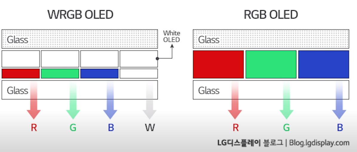 간략하게 요약을 먼저 해보자면, WOLED는 모든 OLED의 소자들을 흰색으로 빛을 내게 하는 것이고, RGB OLED는 소자들이 각각 RGB로 빛을 내고 있는 차이가 있다.