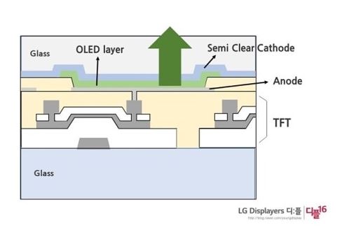 게다가 WOLED는 유기물층에서 생성된 빛이 기판 아래로 나가는 '배면발광' 방식인데, 이는 RGB OLED에서 쓰이는 '전면발광' 방식보다 빛의 효율이 낮다.