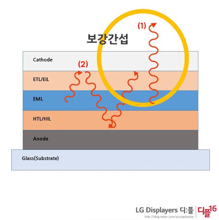 이를 해결하기 위해 연구하다 나온 방법이 '미소공진효과(Micro-cavity effect)'를 이용한 방법인데, 금속을 얇게 증착하는 것이 아닌, 40% 정도의 불투명한 음극을 사용하는 것이다. 아래 그림과 함께 좀 더 살펴보자.