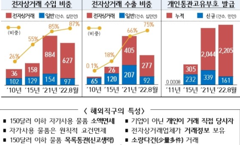 실제로 몇 년 사이 전자상거래 수입 비중 및 해외직구를 위한 개인통관고유번호를 발급받는 사람들이 늘었다. 해외직구의 특징은 사업자가 아닌 개인이 직접 거래를 하며 자가사용 물품을 목적으로 구입 시 면세 혜택이 있다.