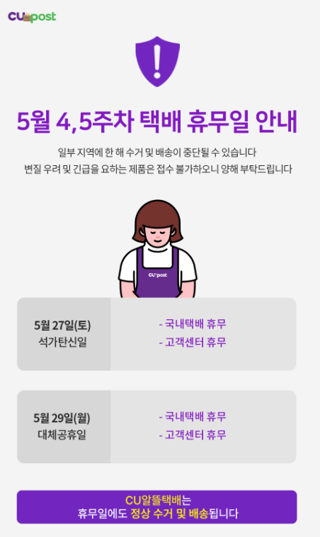 5월 27일부터 29일까지는 석가탄신일, 공휴일, 대체휴일로 택배 휴무 *단, 쿠팡 로켓배송, 제트배송, 로켓프레시, 마켓컬리 샛별 배송, CU알뜰택배, GS25반값택배, 지역마트별 자체 배송 제외