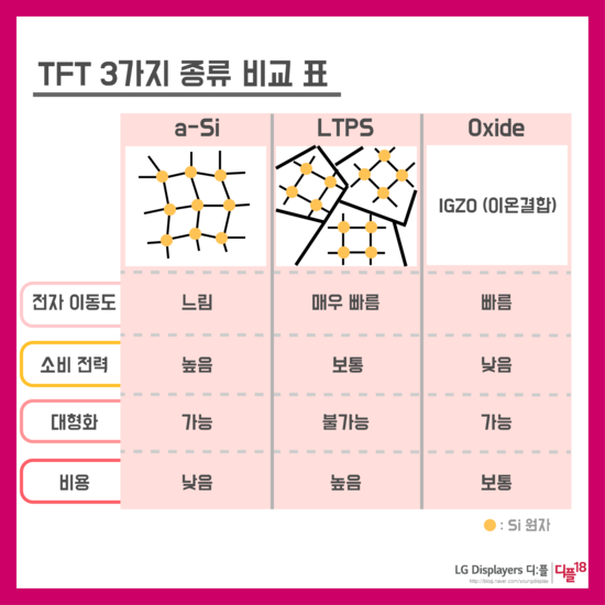 TFT 소재로는 크게 비정질 실리콘(a-SI)과 LTPS로 나뉜다. + Oxide(산화물)
