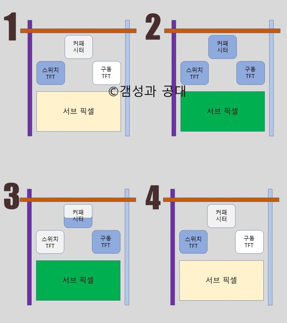 픽셀 하나 당 아래 이미지처럼 스위치 TFT와 구동 TFT 커패시터 및 배선이 함께 있다.