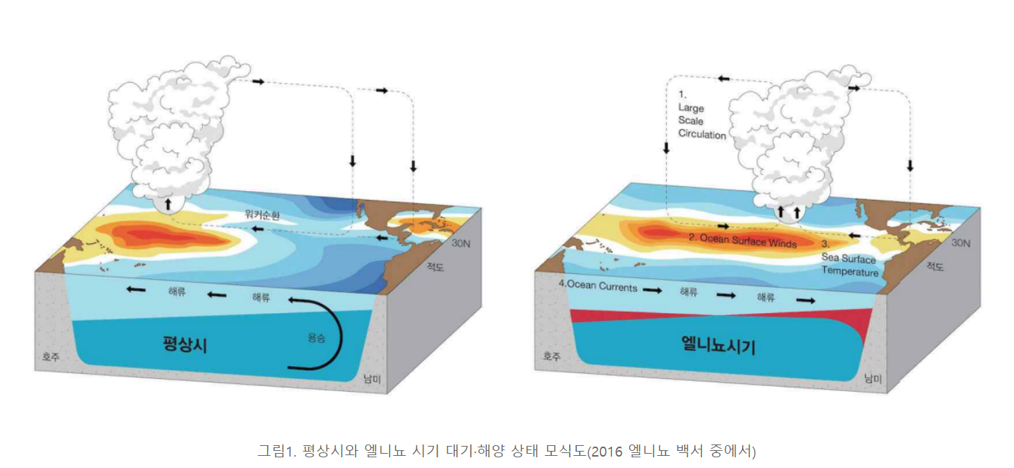 '엘니뇨'는 동태평양의 바다 온도가 상승하는 것을 의미한다. 바다 온도가 따뜻해지는 현상으로 엘니뇨가 오면 지구 전체 기온이 오른다. 일반적으로 엘니뇨는 바다 온도가 0.5도 이상 올라가고 5개월 이상 유지되는 것 말하며 슈퍼 엘니뇨는 1.5~2도 이상 올라가는 현상을 말한다.