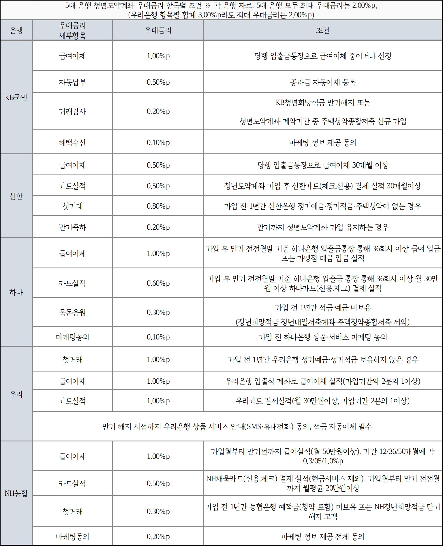 신한, 하나, 우리, 농협은행은 당행 예적금 가입 이력이 없으면 가입자에게 우대금리를 적용한다. KB국민은행은 청년희망적금을 만기 해지만 기존 고객에게 0.2%p 우대금리를 적용한다.