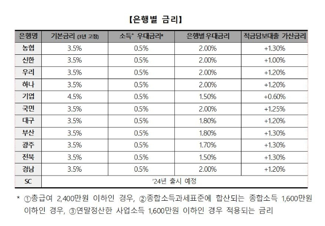 여기에 소득조건 0.5%를 비롯한 일정 조건을 충족했을 때 얹는 우대금리(2~2.5%p)로 구성되며, 우대금리 조건은 은행별로 상이할 예정이다.