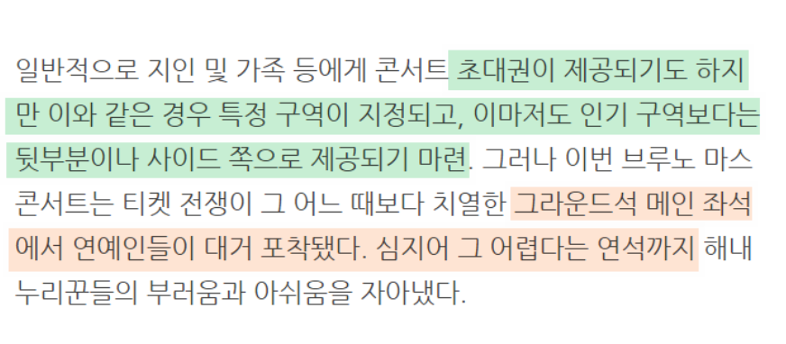 일반적으로 콘서트엔 연예인들에게 초대권을 뿌린다. 화제성 및 마케팅을 위해서기도 하고 비즈니스 측면도 강하다. 다만, 이번 브루노마스 공연은 굳이 이런 행위를 하지 않아도 화제성이 큰 공연이다.