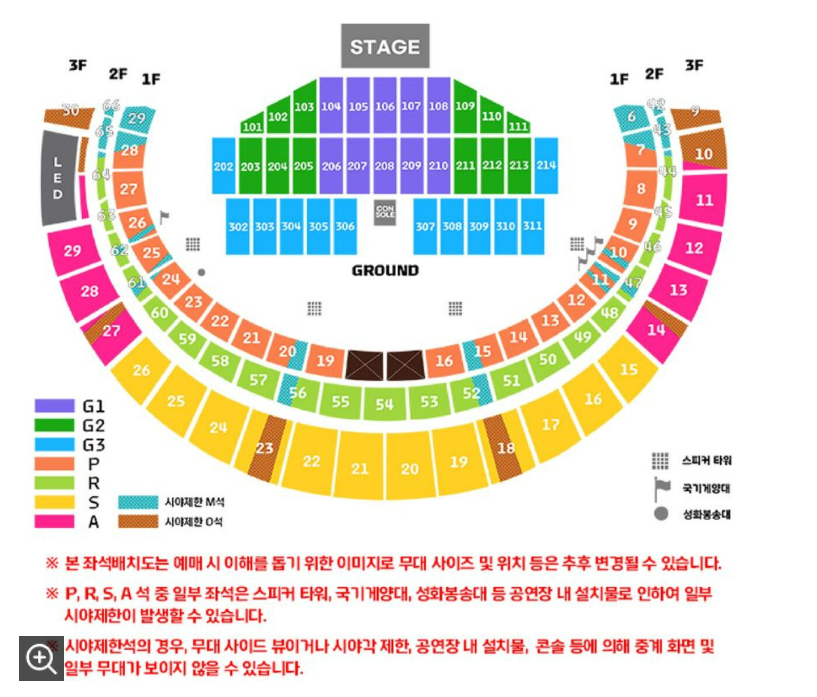 무대랑 전광판조차 보이지 않는 벽뷰다. 현대카드는 국기게양대, 성화봉송대 등 공연장 내 설치물로 인하여 P, R, S, A석도 시야제한이 있을 수 있다고 공지했으며, 시야제한석인 M, O석은 별도로 판매했다.