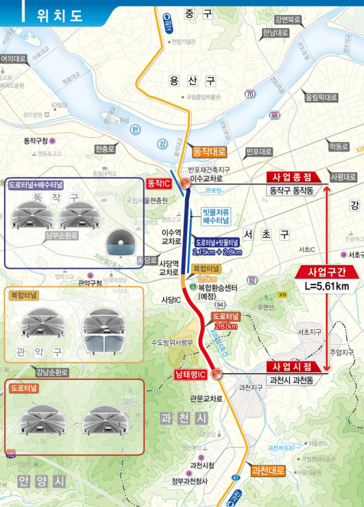 동작구 이수교차로에서 과천 남태령 지하차도 사이 5.4km 구간에 왕복 4차로 도로 터널과 함께 3.3km 길이의 빗물터널을 함께 짓겠다는 계획이다.
