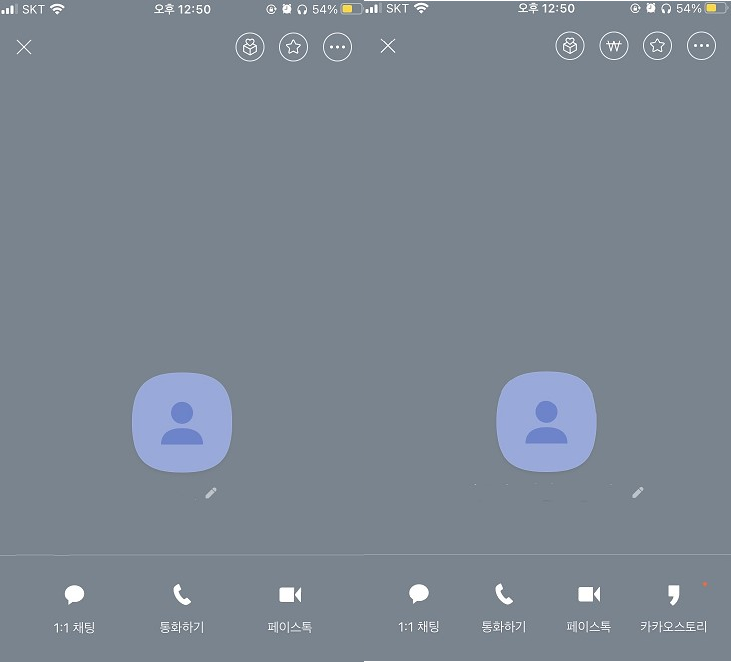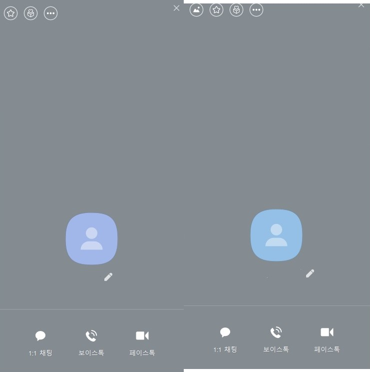 하단 이미지 역시 PC 카톡에서 확인한 것으로 왼쪽은 차단, 오른쪽은 미차단된 프로필 사진이다. 상단에 산 모양의 아이콘 버튼(프로필 배경)이 차단된 프로필에는 보이지 않음을 확인할 수 있다.