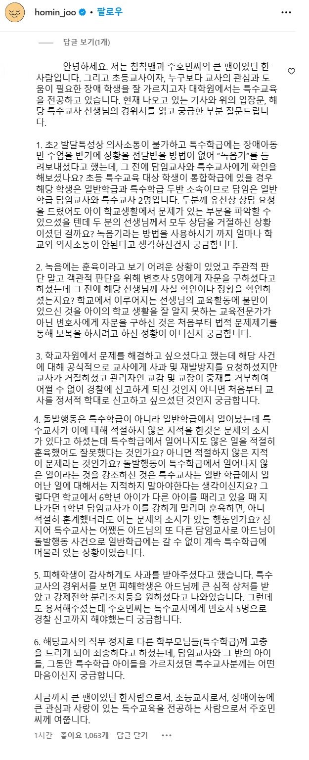 후속 보도에선 주호민의 아들이 2021년 입학했을 때부터 주로 자기보다 작은 여자애들을 주로 때렸으나 장애에 대해 잘 모르니 그냥 넘어가줬다고 주장했다.