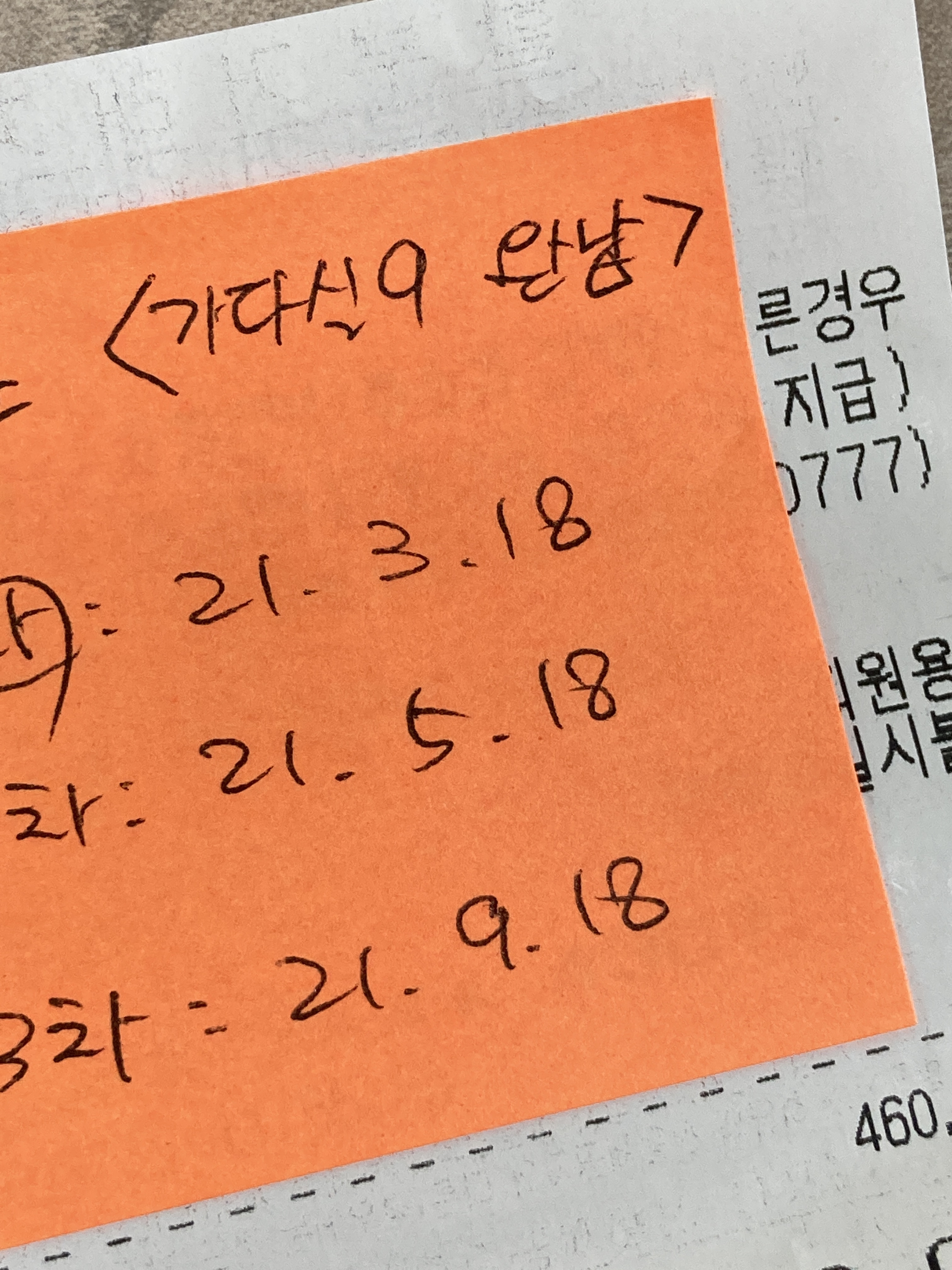 원래는 보통 멋있게 가다실9가 쓰여있는 접종카드를 주는데, 접종카드 재고가 떨어져서 그냥 포스트잇에 붙여주셨다. 2차 접종 때 있으면 달라고 해야겠다. 혹시 영수증이나 접종 시기 날짜를 잊어버릴까 봐 사진으로 저장해 놨다.